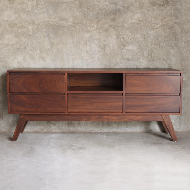 Base para TV, clásica y de estilo moderno, construida en nogal macizo. Incluye detalles tallados a mano y acabado satinado que potencian la calidez única de la madera. Perfecta para realzar tu sala.